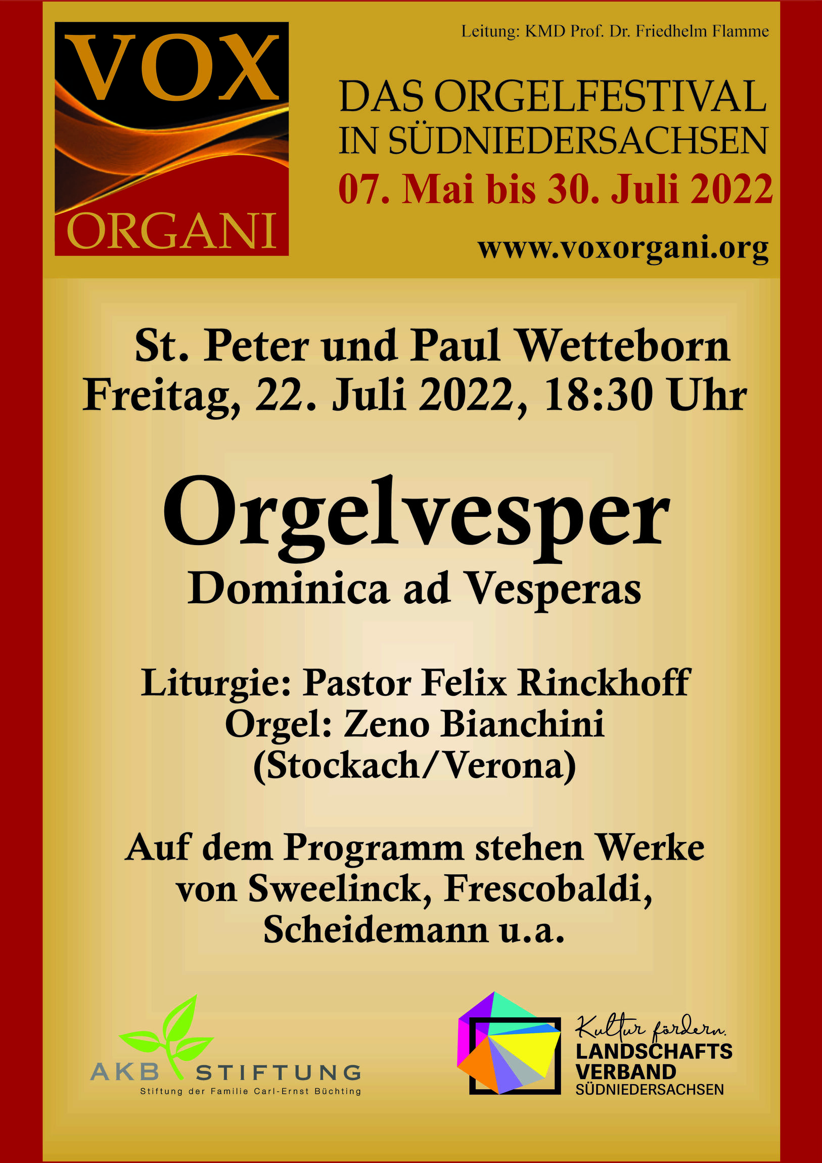 Zum zweiten Mal kommt das südniedersächsische Orgelfestival Vox Organi nach Wetteborn und bringt am 22. Juli den aus Italien stammende und in Deutschland lebende Organist Zeno Bianchini in die Peter und Paul Kirche.