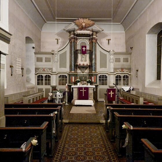 Ihre heutige Gestalt mit den großen Fenstern erhielt die Kirche im ausgehenden 18. Jahrhundert. Aus dieser Zeit stammt auch der barocke Kanzelalter.